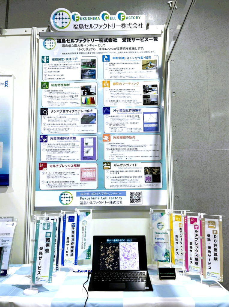ブースでは、弊社の各種解析受託サービスや検体保管サービス、販売中の細胞関連製品についてご紹介しております。
