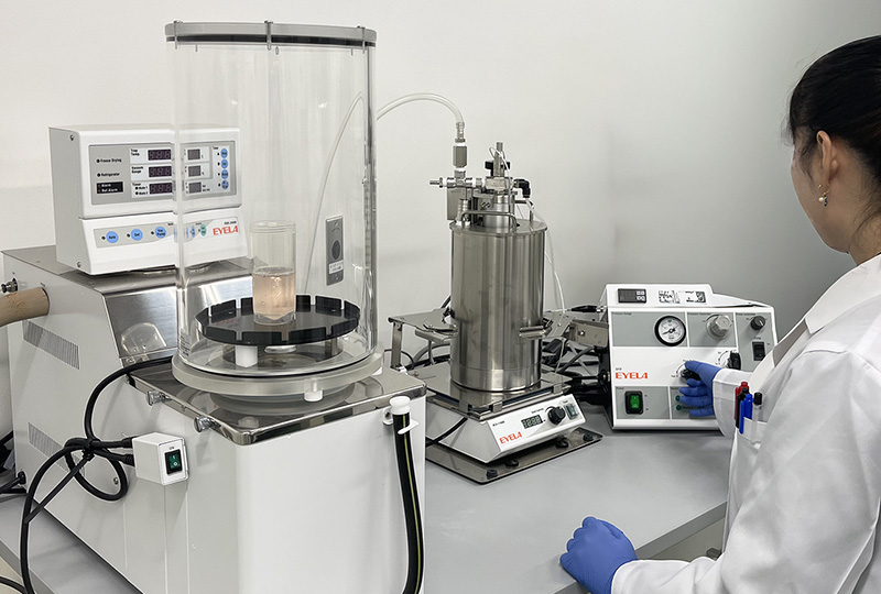 凍結乾燥は、タンパク質などの変性しやすい物質にも適した乾燥方法であり、低含水率で乾燥状態の良好な試料を得ることができます。弊社では2種類の凍結乾燥機(棚式・マニホールド式)に加え、噴霧凍結造粒乾燥装置を備えており、お客様のご要望に応じて使い分けます。「まずは小ロットの試料で凍結乾燥を試してみたい」という方に最適なサービスです。